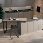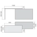 Auszieh- und schwenkbare Anbautisch-Lösung mit Führungsschienen, Mini-Laufrollen, Stützbein mit Gleitern.