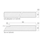 Rahmenoptik (90 mm) durch Ausfräsung, Schubkastenfront ohne Ausfräsung.