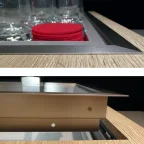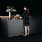 Nadat de bovenste plateau is neergelaten tot het niveau van het werkblad, worden de objecten op de onderste plateau verborgen in de corpus.