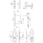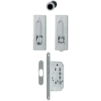 Set bestaat uit rechthoekige komgrepen in messing met trekknop vrij/bezet, insteekslot doornmaat 50 mm en sluitplaat.
