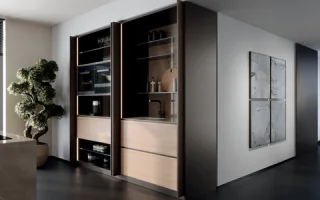 De uiterst compacte en smalle constructie is volledig geïntegreerd in de zijkant van het meubel voor een resultaat dat discreet is wanneer geopend en onzichtbaar wanneer gesloten.