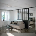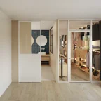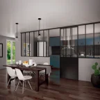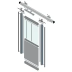 Complete kit voor een schuifdeur in een aluminium glasstructuur interieur.